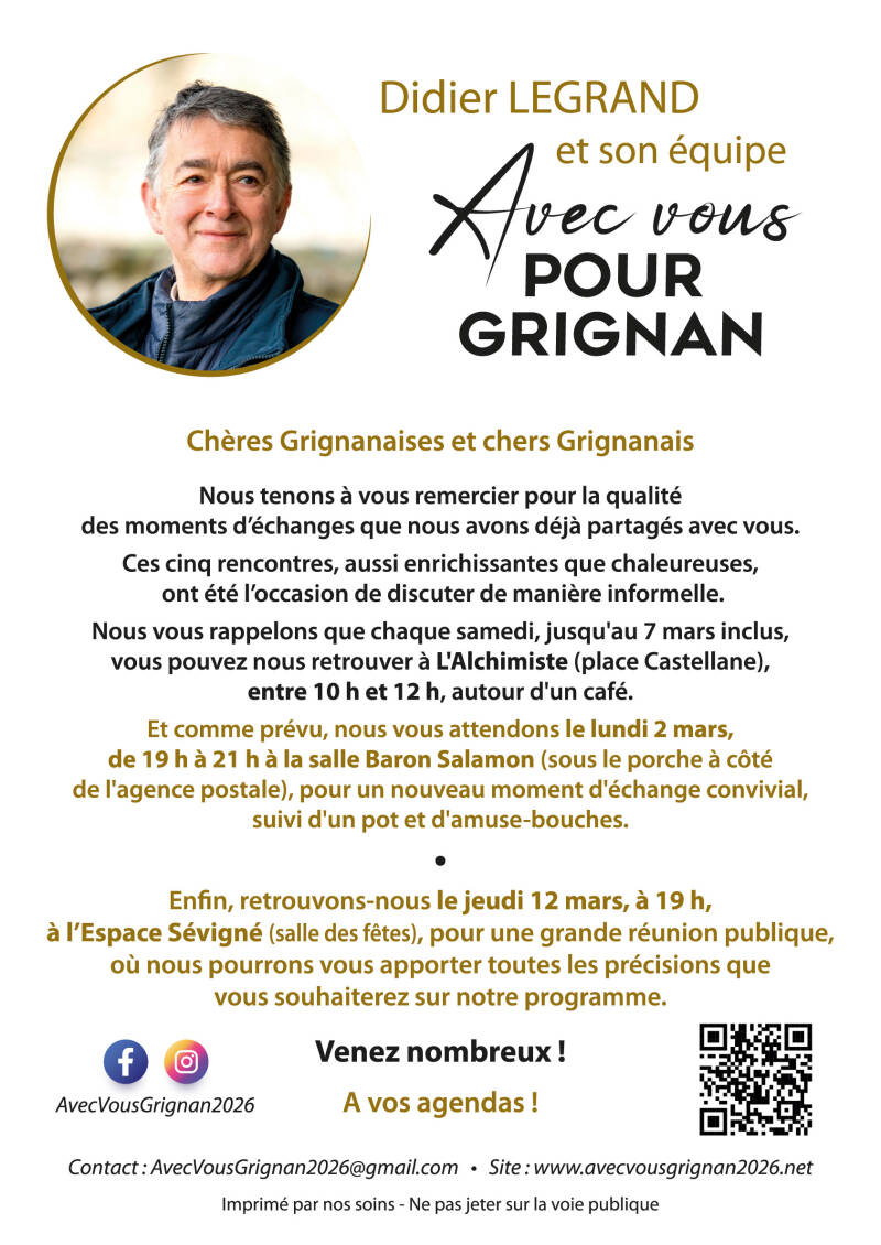 Un très chaleureux remerciement pour vos échanges lors de nos sept réunions et nos cinq permanences ! Vos retours ont confirmé l’importance d’un dialogue transparent et respectueux. Notre programme, concret et responsable, est construit pour Grignan.